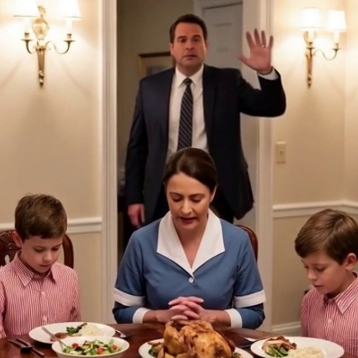 Marta se levantó de inmediato, nerviosa, alisando su delantal. —«¡Perdone, jefe! No lo escuché llegar. Estábamos bendiciendo los alimentos… es que sus hijos insistieron en que cenara con ellos hoy»—.