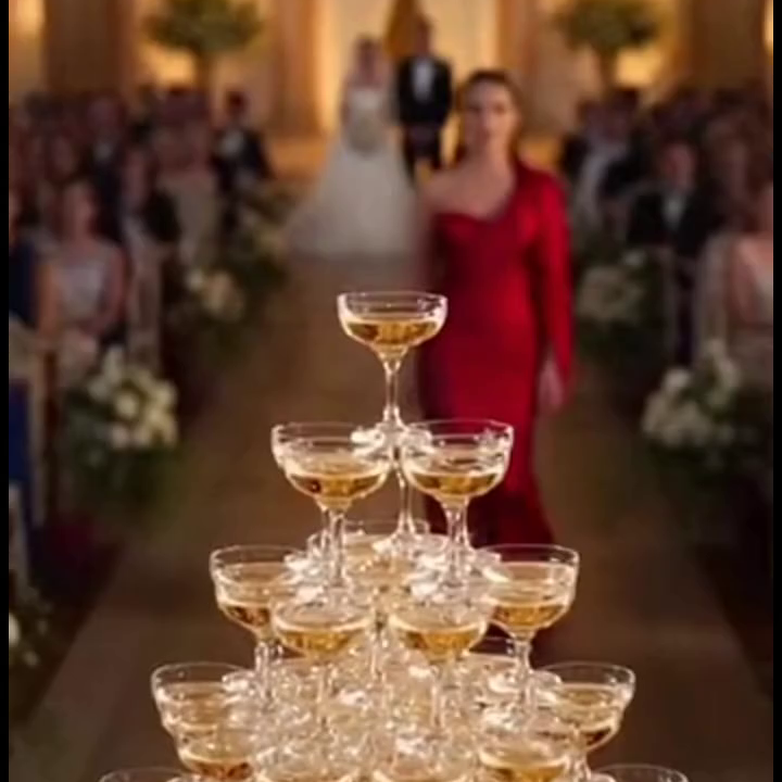 La Catedral de Santa María estaba decorada con orquídeas blancas y velas que bañaban el ambiente con una luz dorada. Cerca de la entrada, una impresionante pirámide de 500 copas de cristal esperaba el brindis triunfal de los recién casados. Todo era perfección hasta que una mujer, vestida con un traje rojo sangre que desafiaba la etiqueta, se acercó a la estructura.