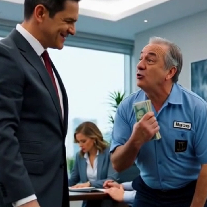 En otra oficina, en el corazón financiero de la ciudad, un gerente llamado Rivera humillaba públicamente a Marcos, el conserje de la empresa. Rivera arrojó un fajo de billetes al suelo con una sonrisa maliciosa. “Recógelos, Marcos, eso es lo único para lo que sirves”, se burló frente a los demás empleados. Marcos, manteniendo una dignidad sorprendente, comenzó a recoger el dinero mientras Rivera continuaba con sus insultos.