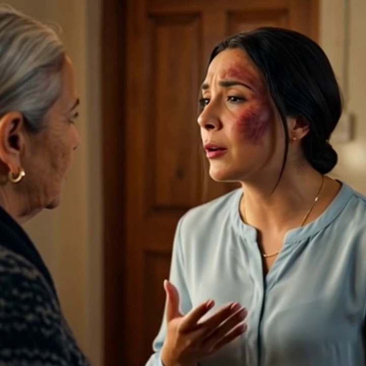 El silencio de la tarde se rompió con el sonido metálico de una llave girando en la cerradura. Doña Elena, una mujer de cabellos blancos y mirada serena, entró a la sala con una bolsa de pan fresco, esperando encontrar la paz de siempre. Sin embargo, al encender la luz, descubrió a su nuera, Lucía, sentada en un rincón de la cocina, intentando ocultar su rostro entre las manos. La suegra llega a casa de su hijo y vio a su nuera golpeada, con un hematoma profundo oscureciendo su pómulo izquierdo y el labio partido.
