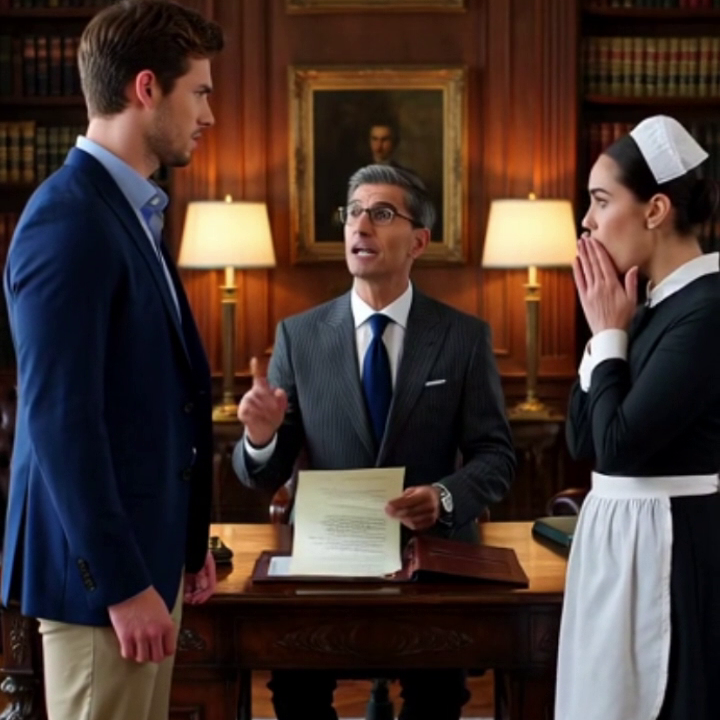 En la oficina del abogado, el silencio era casi sólido. Julián, vestido con un traje de diseñador, golpeaba impaciente el suelo con su zapato italiano. Frente a él, en una silla sencilla, María, la joven que había limpiado la mansión durante los últimos tres años, mantenía la mirada baja.