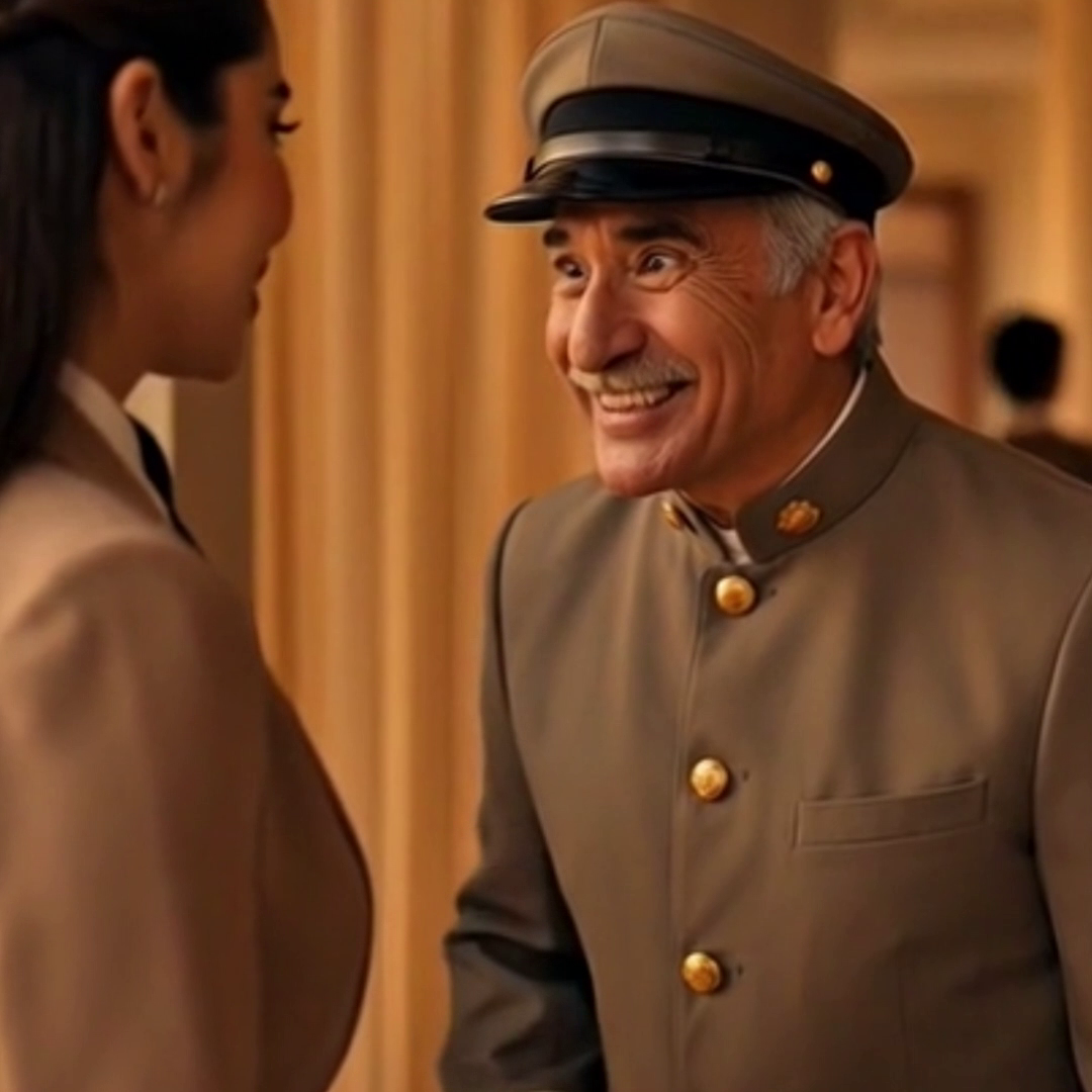 —«Bienvenida al hotel, señora. Permítame ayudarle con su bolso»— dijo el hombre con una voz cansada pero llena de cortesía.