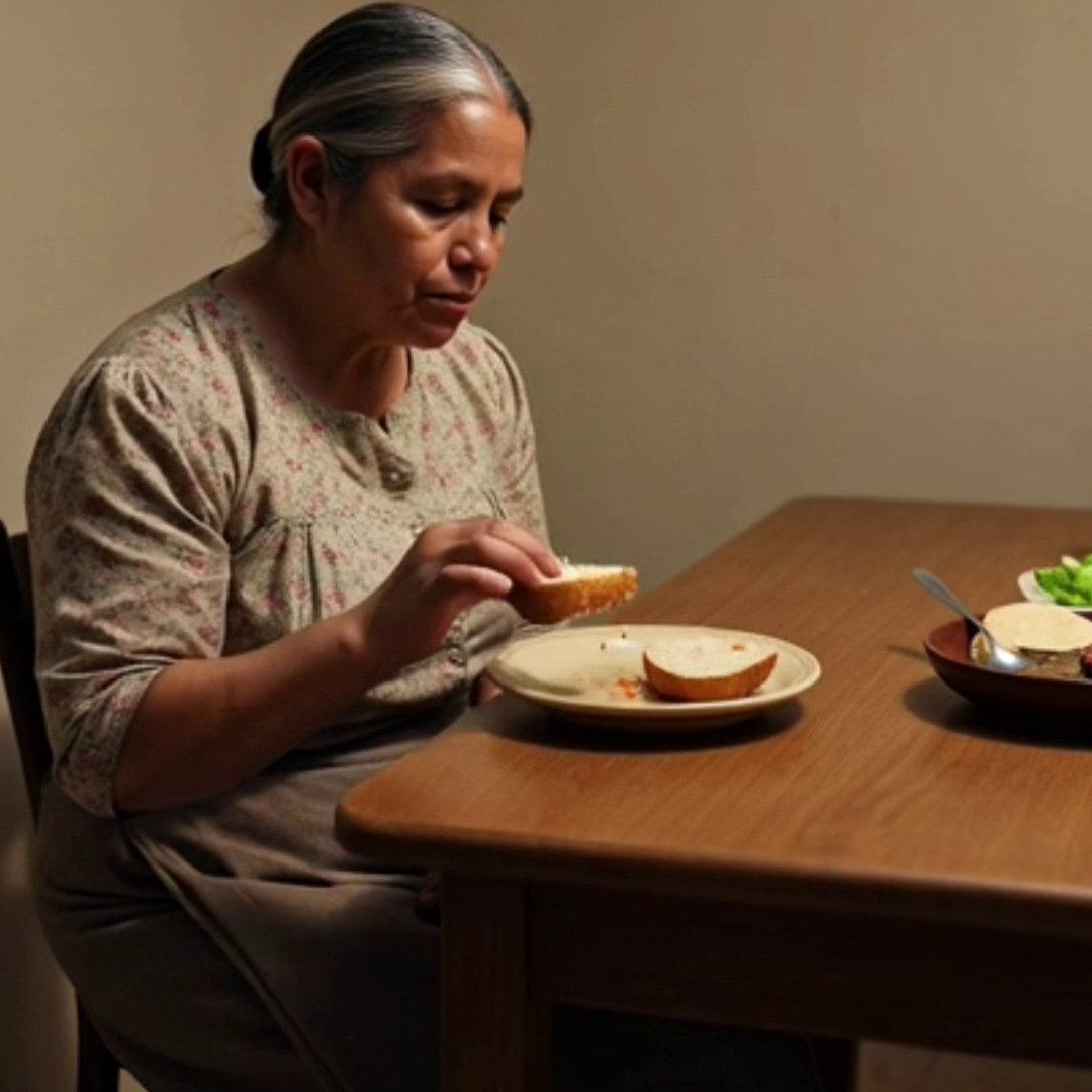 En el comedor de una casa de clase media, el aroma a pollo asado llenaba el aire. Ricardo y su esposa, Silvia, disfrutaban de una cena abundante, mientras que en un rincón de la cocina, Doña Marta, la abuela, comía un pedazo de pan duro y unas sobras de arroz del día anterior.
