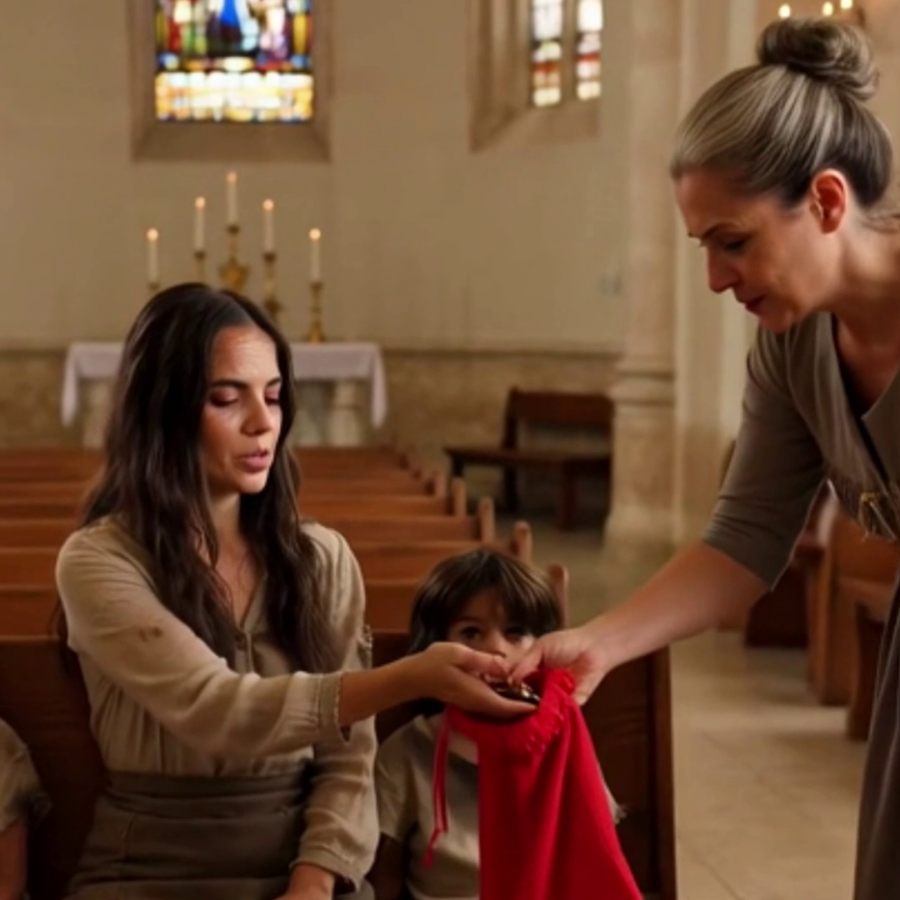 En una antigua iglesia de piedra, el silencio solo era interrumpido por el eco de los pasos de la colectora. Se acercó a una mujer de aspecto humilde, vestida con ropas sencillas y una manta sobre los hombros, quien estaba sentada junto a su pequeño hijo. «Para la iglesia, por favor», dijo la servidora extendiendo una bolsa roja de tela. La mujer, con manos temblorosas pero decididas, sacó las pocas monedas que guardaba en su regazo. «Tome, es todo lo que tengo», susurró con una paz que contrastaba con su evidente necesidad.