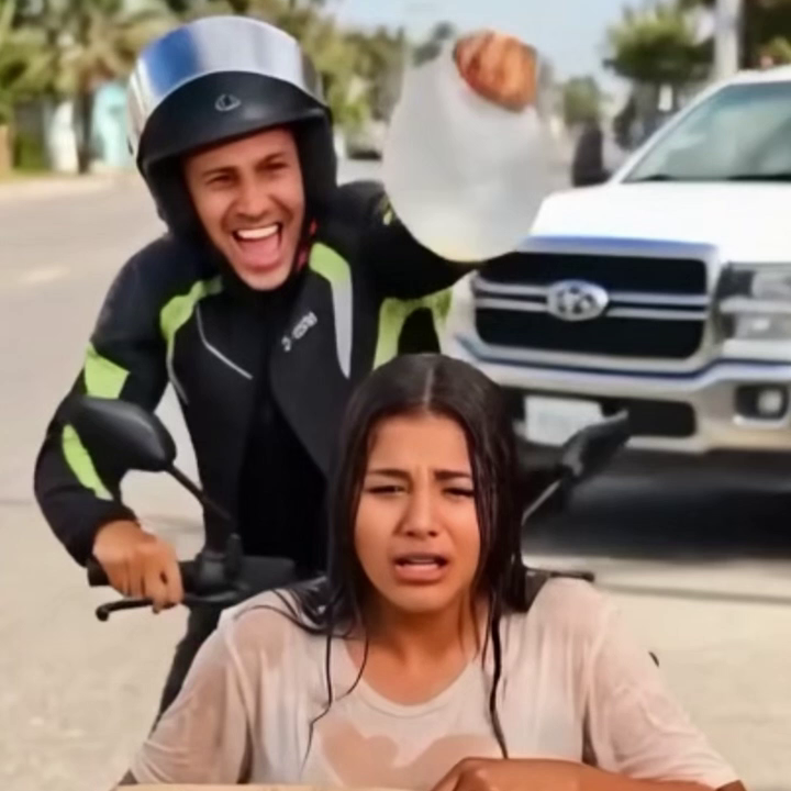 La mujer, sorprendida y con el rostro cubierto por el agua fría, intentó limpiarse los ojos mientras temblaba de la impresión. El agresor, lejos de mostrar arrepentimiento, aceleró su vehículo haciendo piruetas innecesarias. El hombre se va en su moto riendo , celebrando su acto de crueldad como si fuera una broma divertida, dejando a la mujer sumida en la impotencia y la vergüenza de su situación.