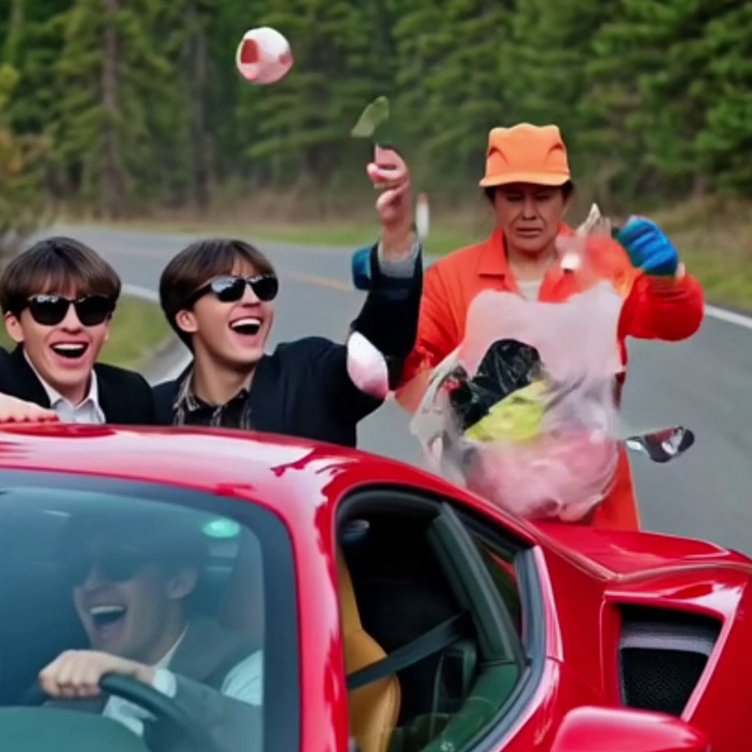 De repente, un rugido rompió la calma. Un Ferrari de color amarillo chillón pasó a toda velocidad, pero antes de alejarse, se frenó un poco. Desde la ventanilla, un grupo de tres jóvenes de unos 20 años lanzaron una bolsa llena de desperdicios y restos de comida rápida directamente hacia donde ella estaba.