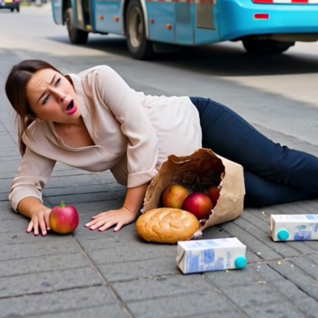 El impacto hizo que Elena perdiera el equilibrio y cayera pesadamente al suelo, soltando sus bolsas mientras soltaba un grito de dolor y susto.