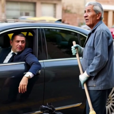 Un hombre de avanzada edad, con el cabello canoso y ropas sencillas, se encontraba agachado en la calle limpiando profundamente el suelo con un trapo y un balde con agua. Su esfuerzo era notable, dedicándose a que cada centímetro quedara impecable. En ese momento, un joven con actitud soberbia, que vestía un traje impecable y conducía un auto de lujo, se detuvo frente a él.