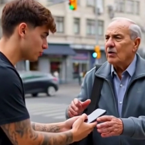 Un anciano jubilado con una chaqueta gris desgastada caminaba por la calle, con un mapa de papel en la mano y cara de confusión. Se detuvo ante una mujer joven que estaba absorta mirando su teléfono móvil de última generación.