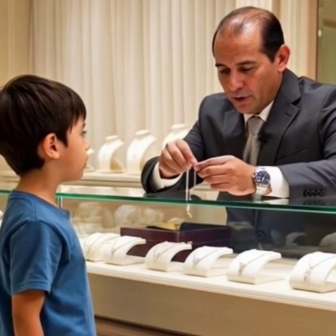 Un niño pequeño entró en una lujosa joyería, caminando con paso decidido hacia el mostrador principal. El joyero, un hombre elegante, lo observó con atención mientras el pequeño sacaba un objeto de su bolsillo: un collar de plata con un dije de corazón.